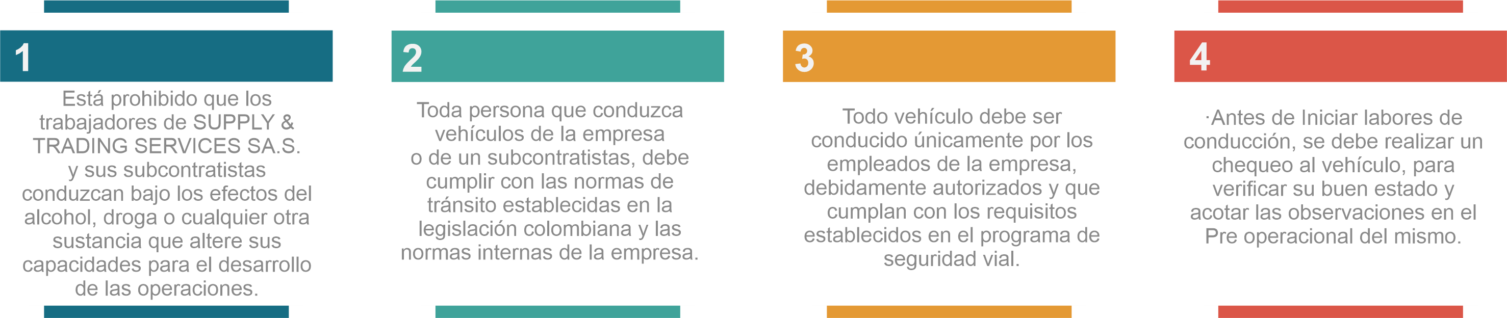 SUPPLY AND TRADING SERVICES SAS En su compromiso de mantener la seguridad integral de sus trabajadores y en cumplimiento de la reglamentación establecida en el Código Nacional de Tránsito Terrestre según la ley 769 de 2002, se basa en las siguientes medidas las cuales deben ser cumplidas por todo el personal permanente o temporal: